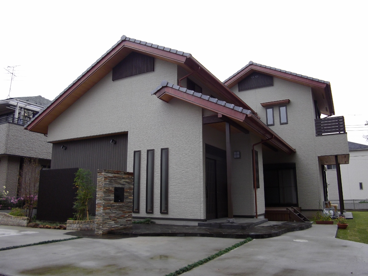左側は数寄屋造り風としています。奥行きのある軽妙な屋根のつくり、二段の屋根が特徴です。