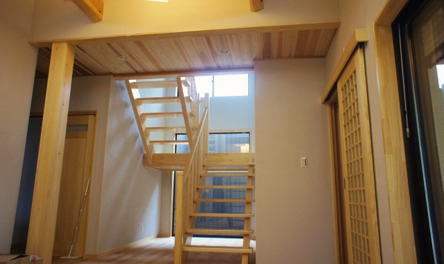 吹き抜けのあるリビングから階段を見ています。