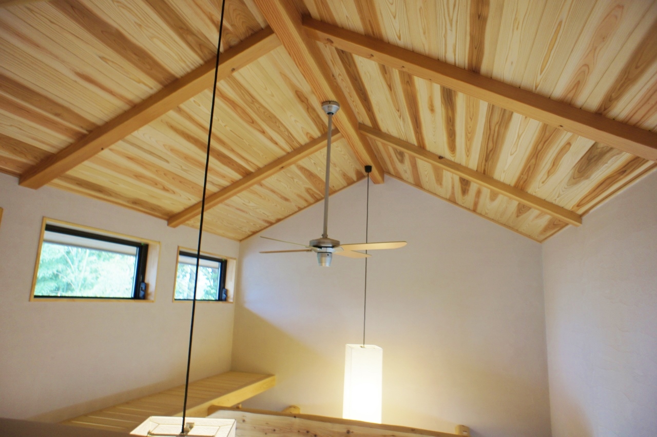 屋根勾配に合わせた勾配天井で梁を現しにして無垢の羽目板で仕上げています。