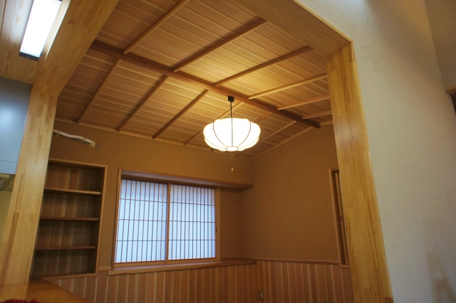 ダイニングの天井は勾配をとって竿縁での仕上げです。