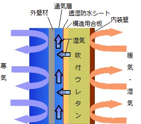 気密が保たれていれば、室内の湿気は図のように断熱材の室内側の防湿層に阻まれ、室内の湿気が外の冷気に冷やされて起こる内部結露は起こらない構造になっています。