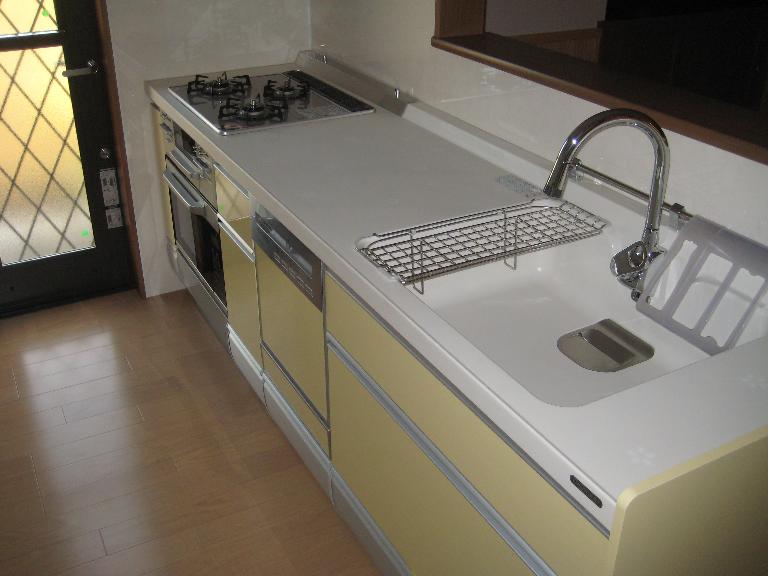 キッチンです。流しの中もカウンターと同じ人造大理石となっており、