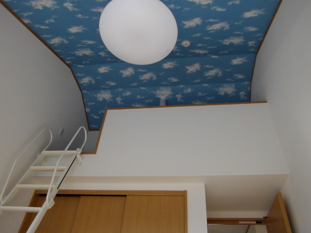 勾配天井として、手前入口側の天井が高くなるようにしています。