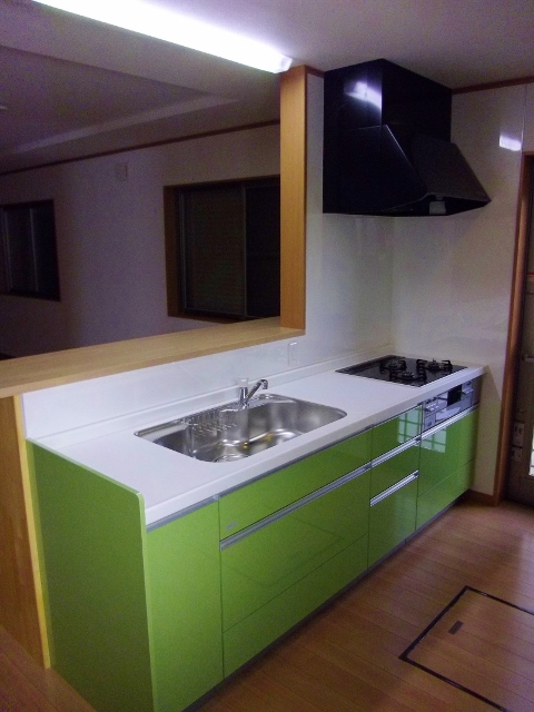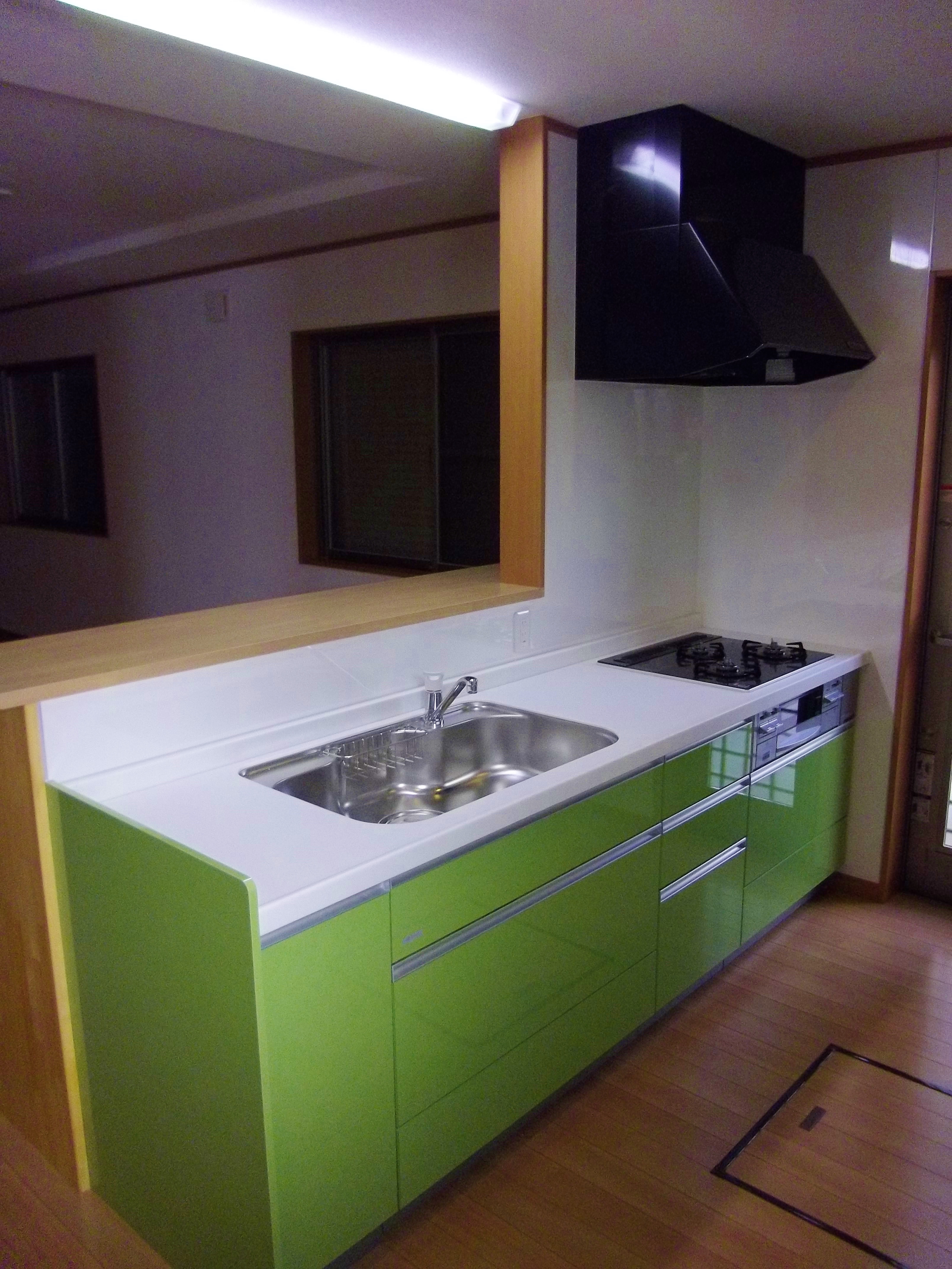 キッチンは背面を収納とし、対面型のオープンなものとしています。