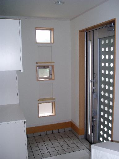 玄関建具は光を通す物とし、3連小窓をつけ明るい玄関としています。