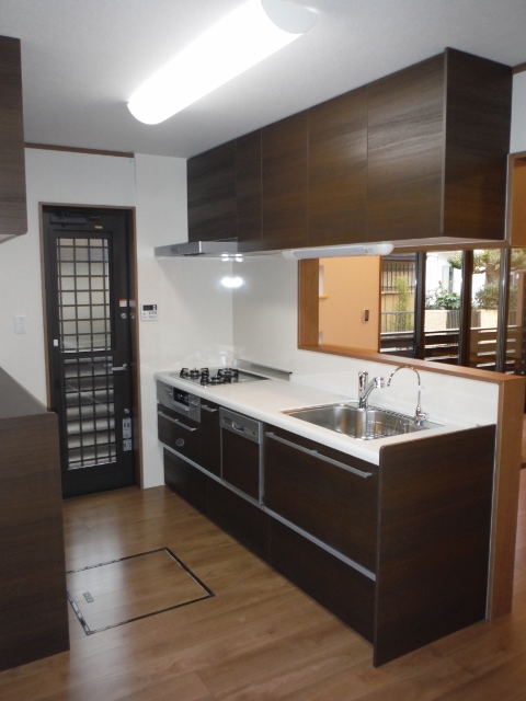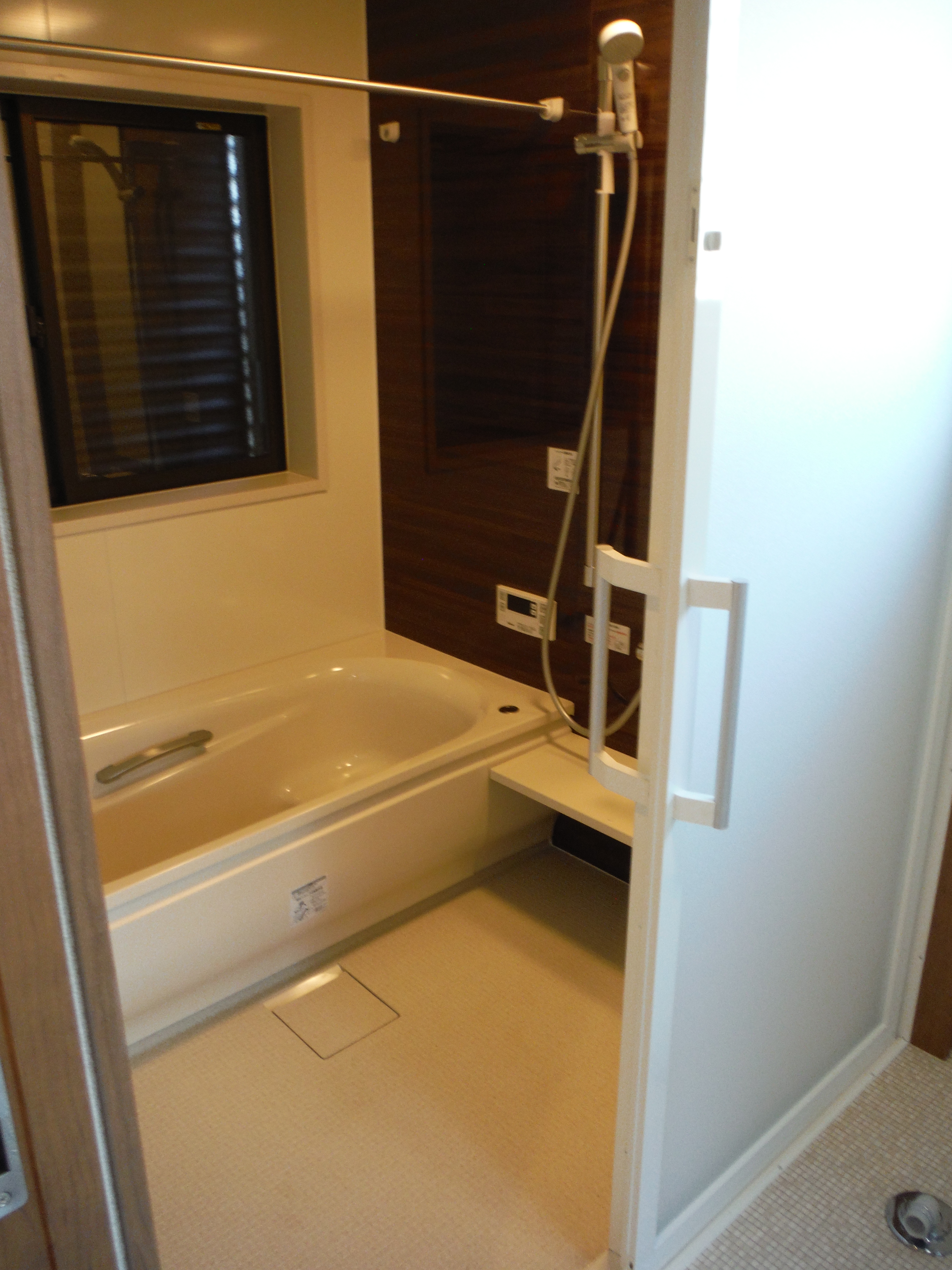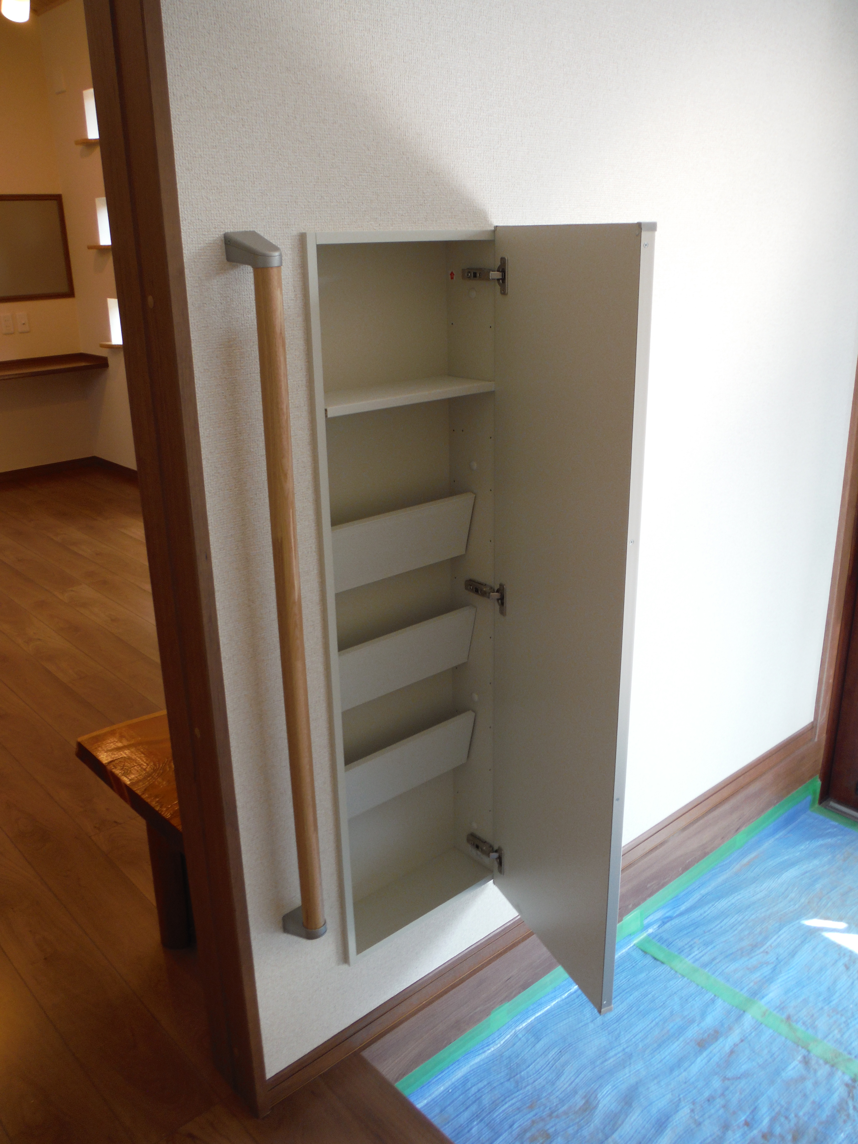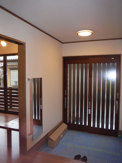 玄関内部でも玄関建具の色は室内の茶色をテーマとしたデザインとよく調和しています。写真左手の鏡は開くとスリッパ入れとなっています。(次写真)