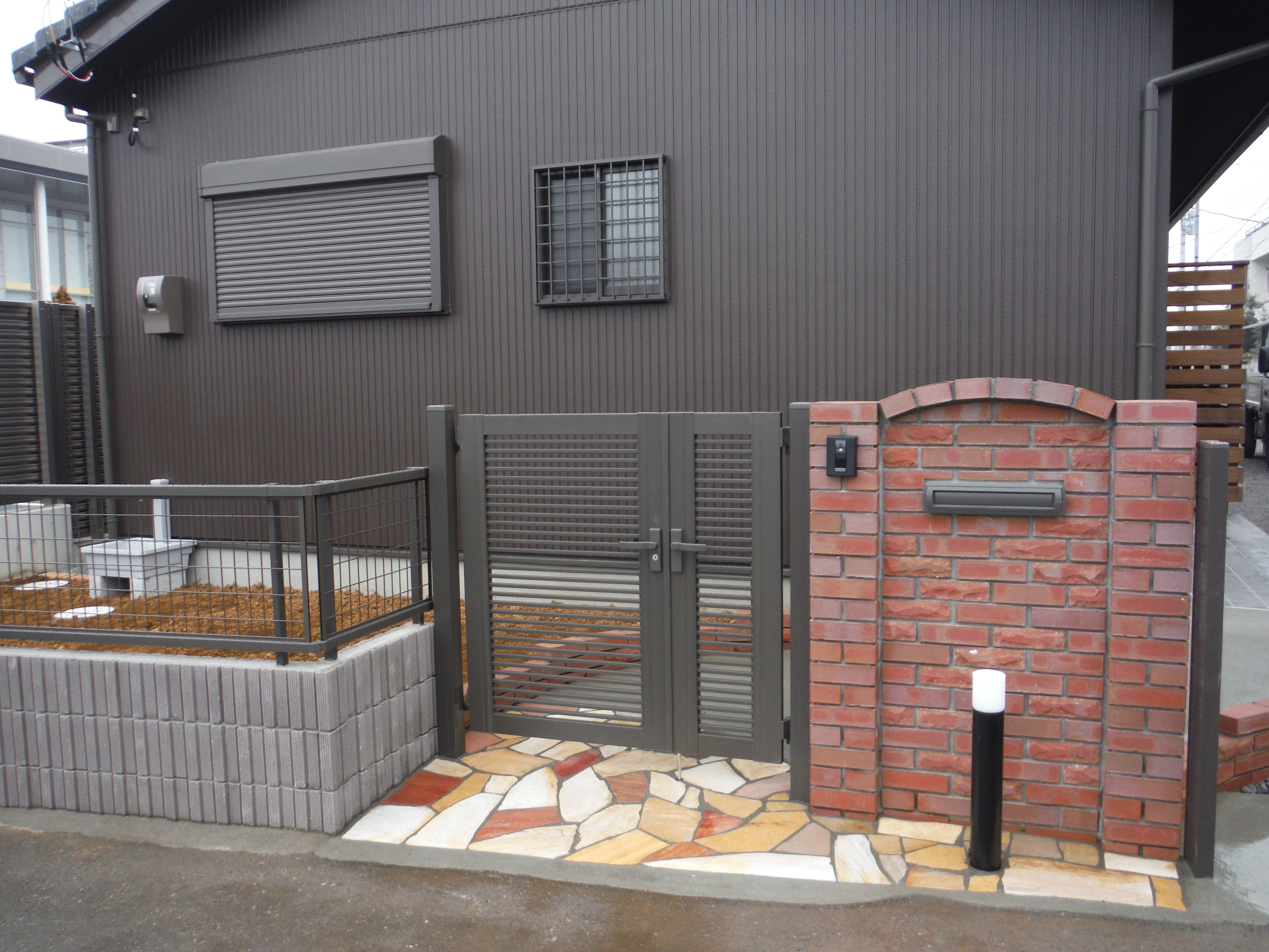 門柱には煉瓦を使い、赤でアクセントをつけました。床の割れ石には赤紫を混ぜることによってインパクトを出すことを狙っています。