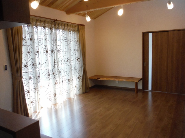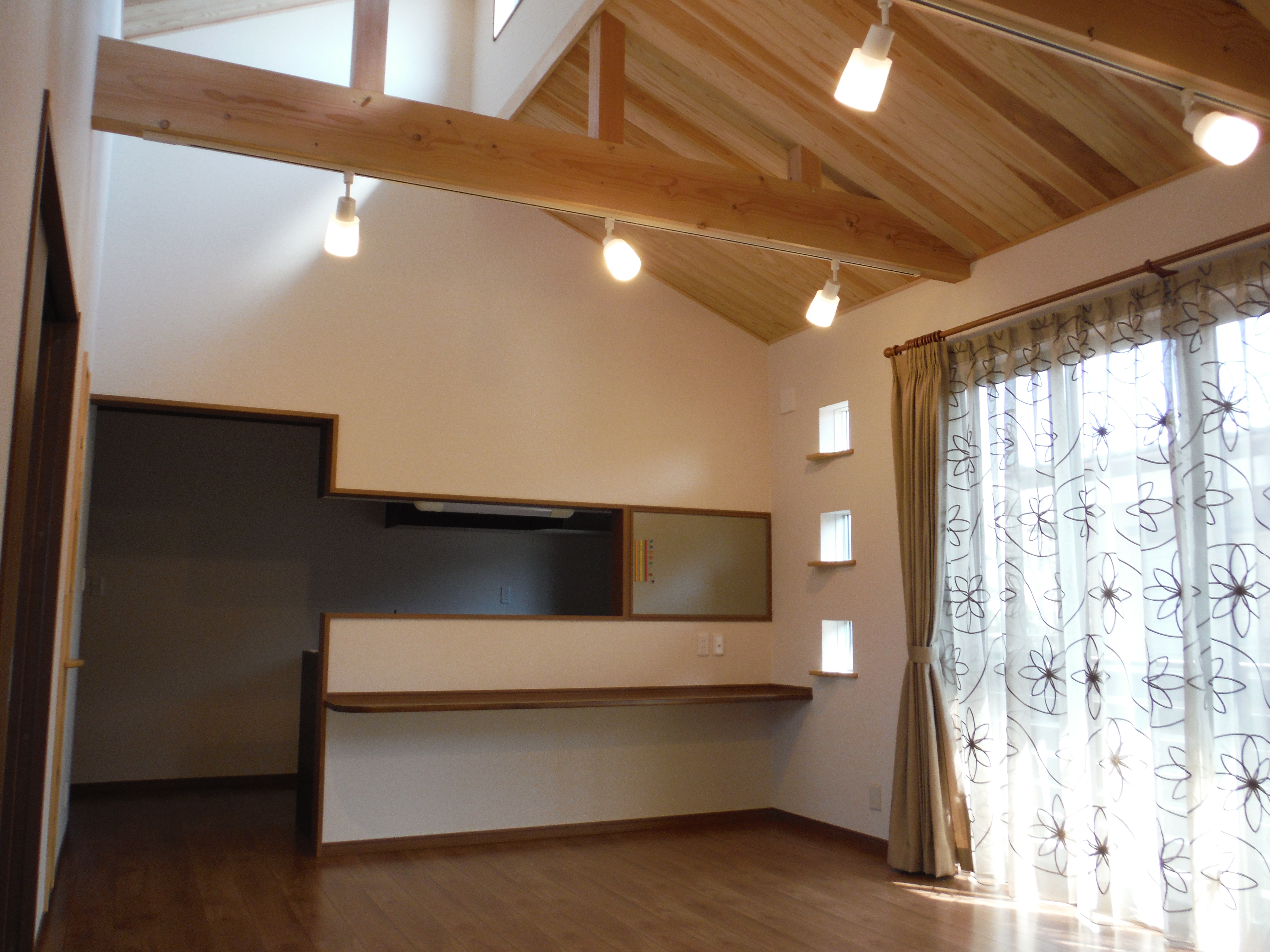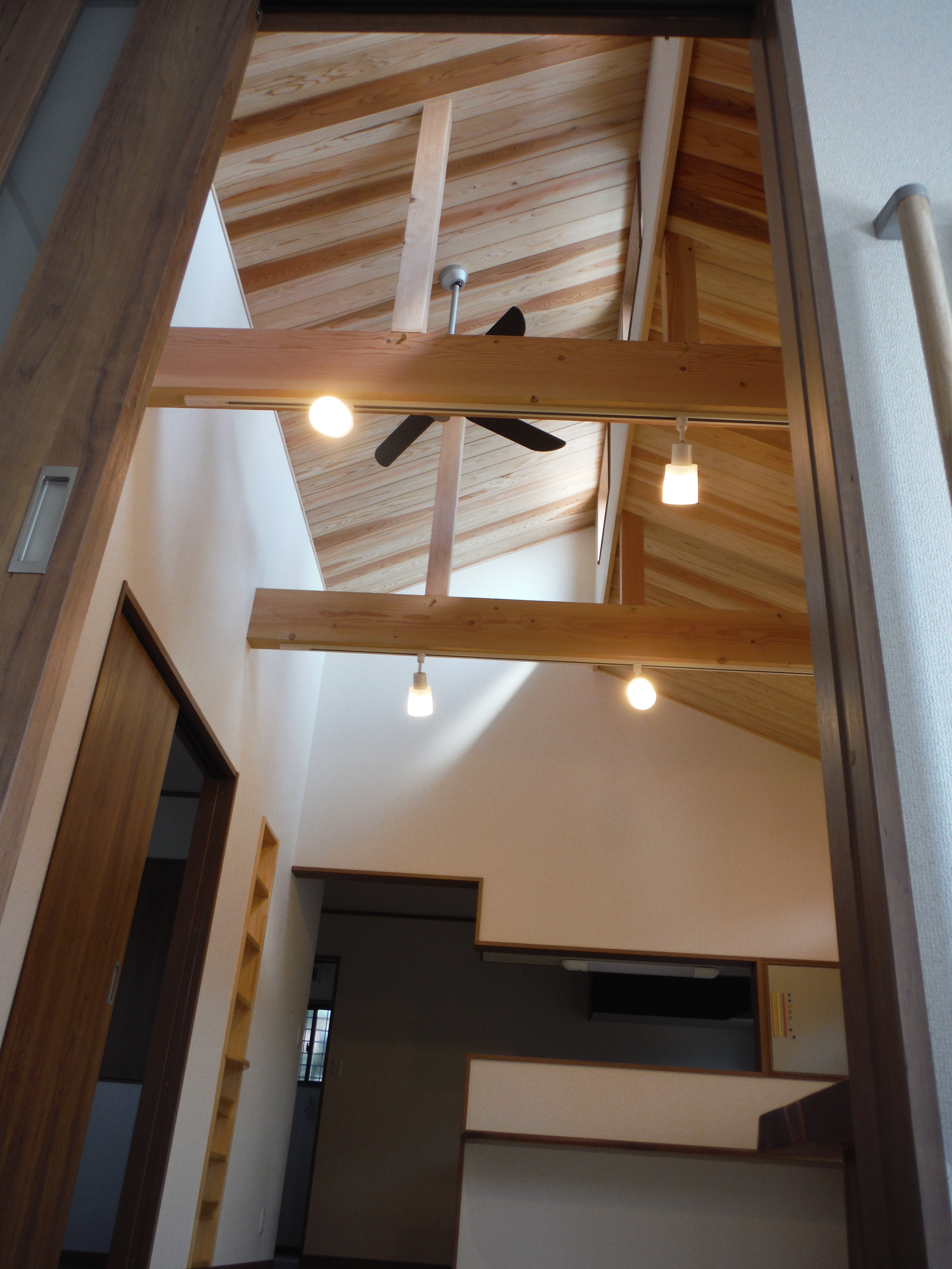 天井は天窓までの吹き抜けとし、無垢の杉板をワックス仕上げで張ってあります。化粧梁にスポットライトの照明をつけています。