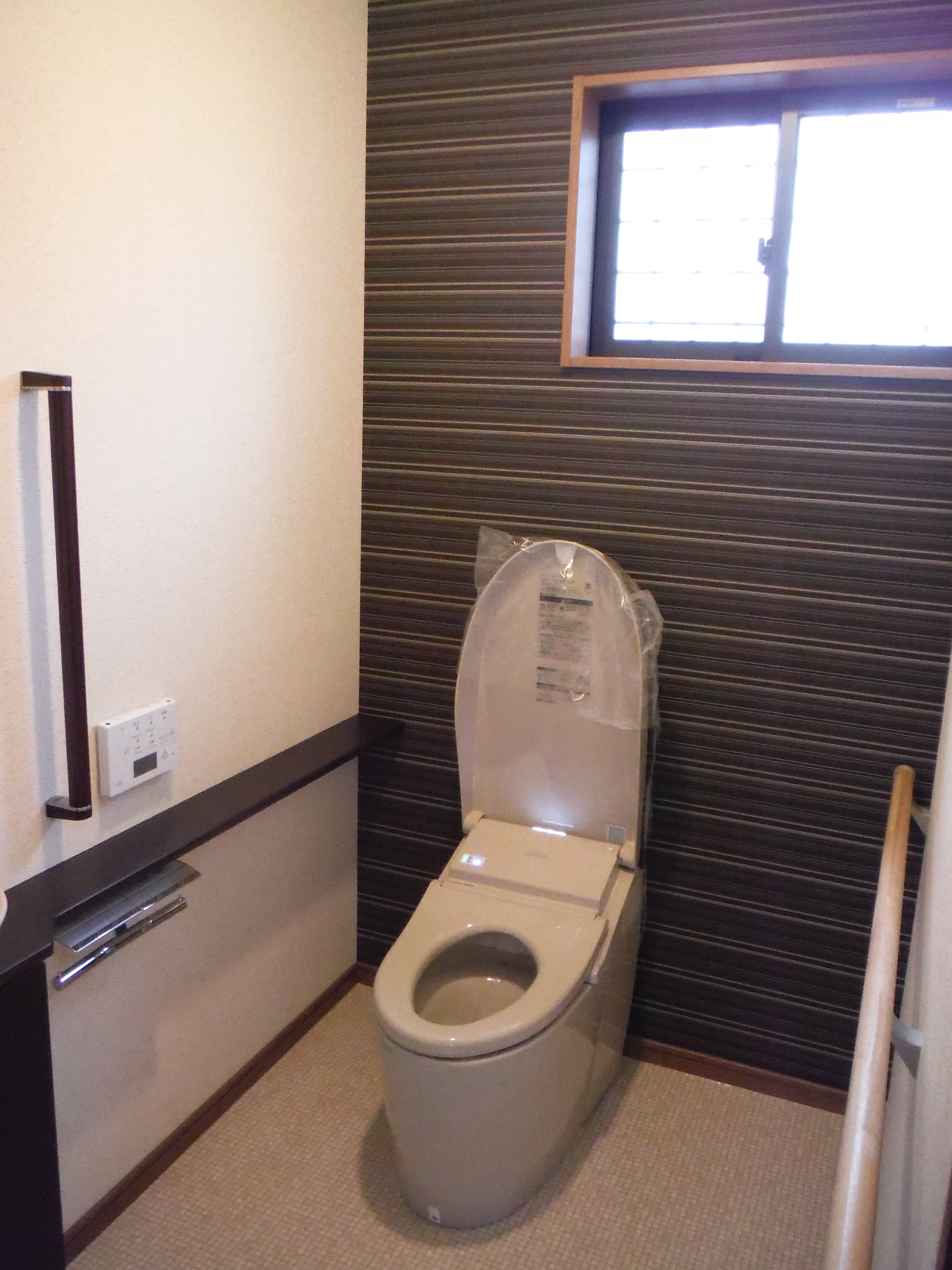 トイレの壁は一面アクセントとして色を変えています。壁も洗面カウンターも茶色で統一しています。